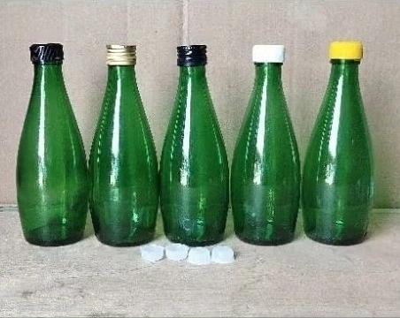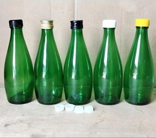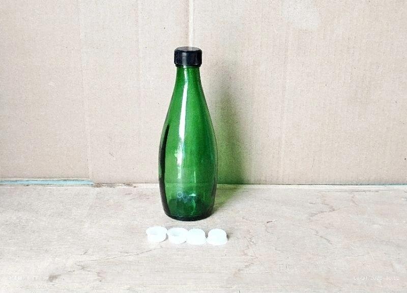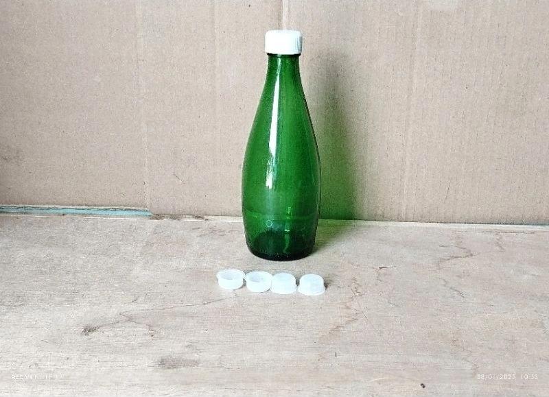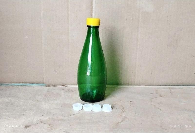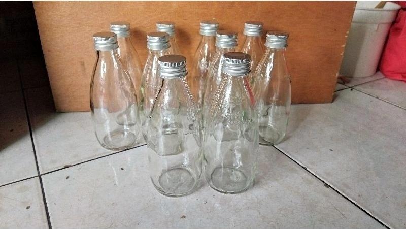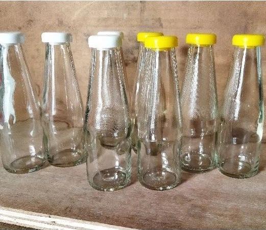Botol kaca 250ml untuk soda dan minuman berkarbonasi. Tinggi = 15cm, Diameter = 6cm, Volume = 250ML