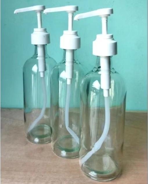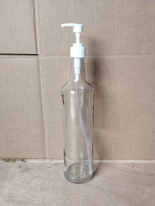 Botol kaca 1 liter dengan pump dispenser besar. Tinggi = 35cm, Diameter = 8cm, Volume = 1000ML